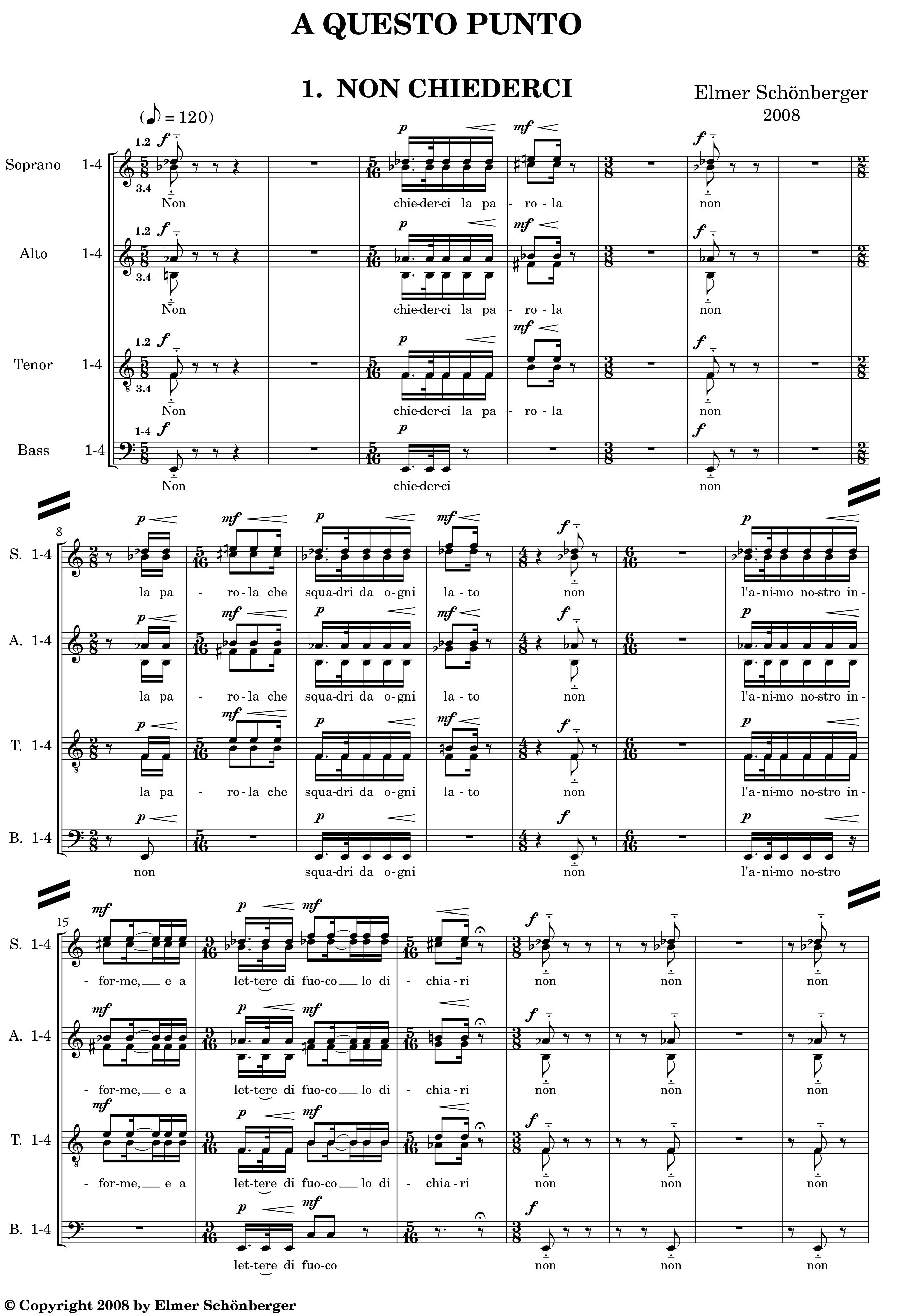 Drie van de vier gedichten in deze cyclus zijn ontleend aan het ‘late’ werk van Montale (gepubliceerd tussen 1973 en 1981), het eerste is afkomstig uit Ossi de seppia, waarmee Montale in 1925 debuteerde. – De late Montale is de dichter die voldoende heeft aan wat motten, muizen en een kaarskorst om het soortelijk gewicht van La verità, de waarheid, te wegen. In de muziek is de waarheid een aldoor herhaalde opeenvolging van akkoorden in de mannenstemmen. – Er zit veel dood en eindigheid in Montale’s late gedichten, maar hoe goed daarmee te leven valt, leert het bezwerende A questo punto: ‘Laat hier maar los, zegt de schaduw’. – Tergi gli occhiali appannati is opnieuw een oproep: ‘veeg je beslagen brillenglazen schoon’. – In Non chiederci la parola, dat ruim een halve eeuw eerder werd geschreven, klinkt de stem van de jonge Montale, die wel een dichter van de afwezigheid en de ontkenning is genoemd: ‘Slechts dit kunnen we je zeggen vandaag: / dat wat we niet zijn, dat wat wij niet willen.’