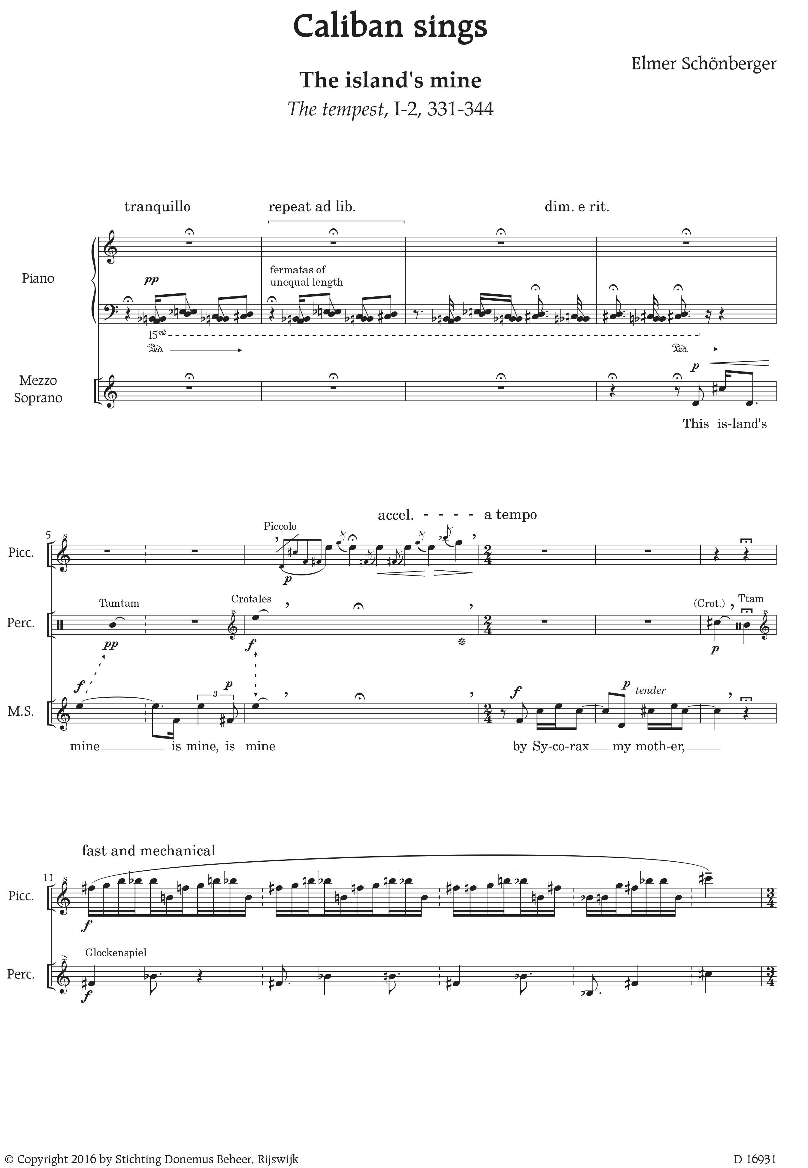 Hoewel Calibans aanwezigheid in het stuk zich voortdurend doet voelen, is het aantal regels dat Shakespeare hem heeft toebedeeld beperkt. De meeste van zijn teksten regels zijn ook nog eens boos, verongelijkt, agressief, klagerig of kruiperig, met als grote uitzondering de verdwaalde poëzie van ‘Be not afeard; the isle is full of noises’. Is het de stem van Caliban die we hier horen of worden de woorden hem van buitenaf ingeblazen? In dit laatste lied met zijn zachte canons, zijn verre ‘sounds’ en zijn milde mandoline is alle ongeluk en woede even vergeten.