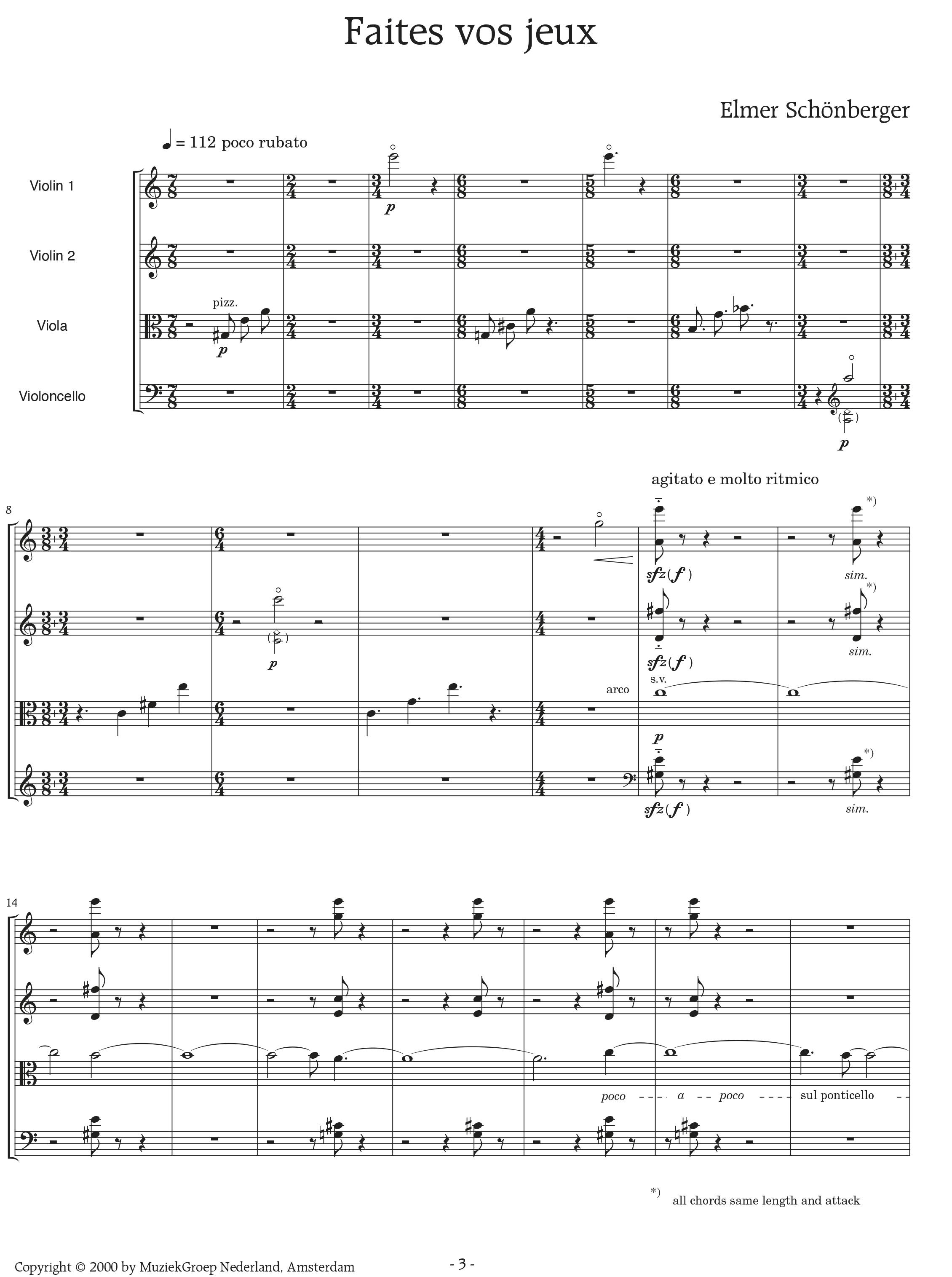 De enige muziek die ik voor Kwartetten schreef, waren negen maten ‘linkshandige’ muziek ter introductie van een fragment uit het Vierde strijkkwartet van Milhaud. Na afloop van de eerste reeks voorstellingen begon ik met het componeren van een mogelijke muzikale voorgeschiedenis van deze negen maten. Faites vos jeux was het resultaat. In Kwartetten lieten de individuele acteurs/musici in terzijdes doorschemeren het eigen instrument in feite als de kern van het strijkkwartet te beschouwen. In Faites vos jeux zijn ze allemaal gelijk. Alleen mevrouw de altviool is iets gelijker.