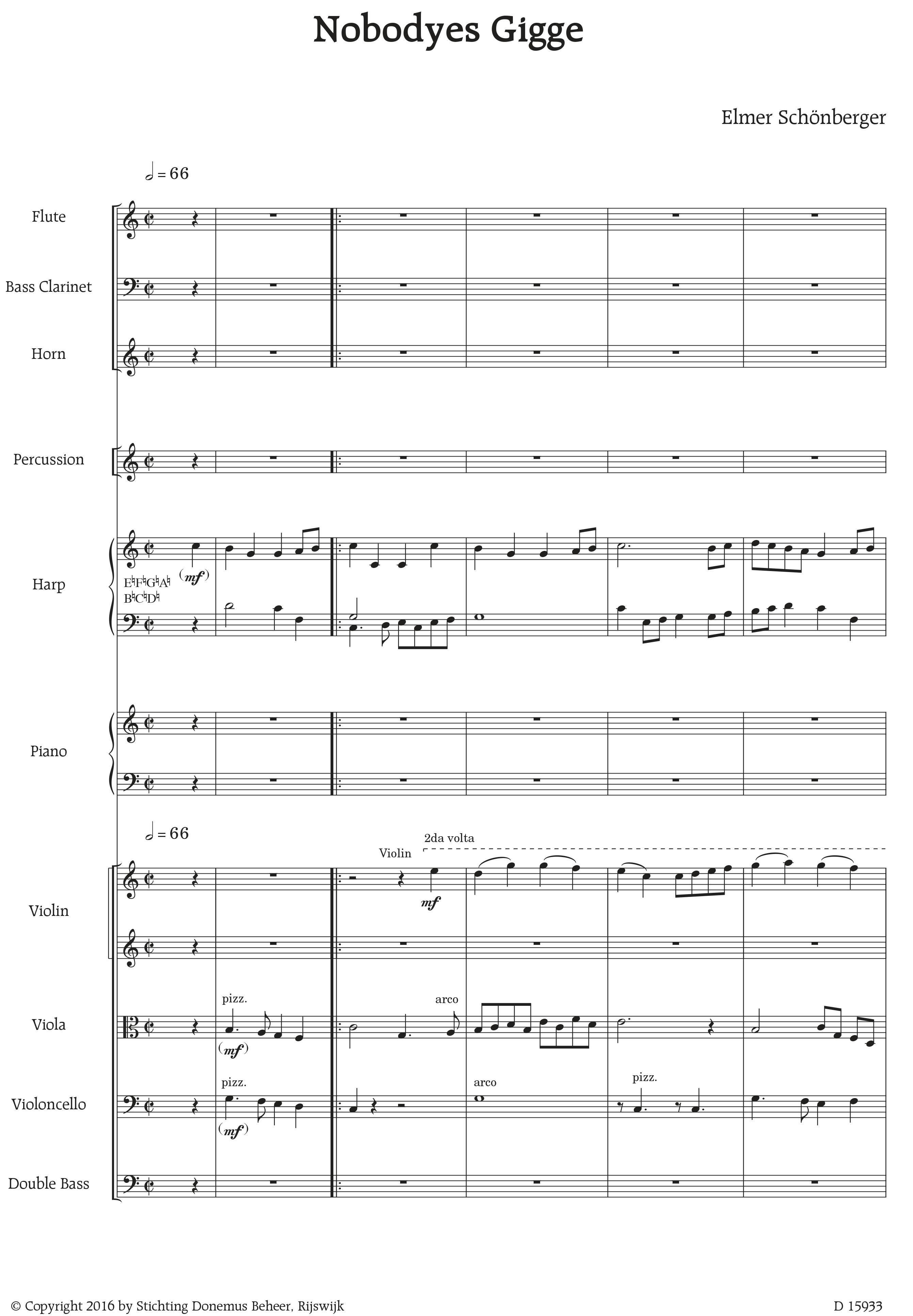 fluit, klarinet/basklarinet, hoorn – vibr., marimba, field drum – harp, piano – vl1/mandoline, vl2, vla, vc, cb