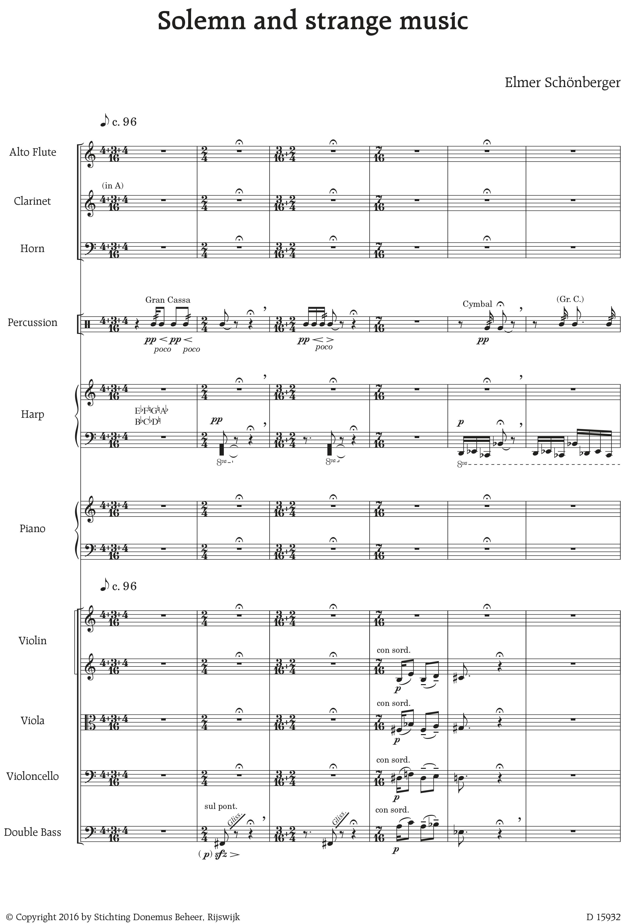 fluit/piccolo/altfluit, klarinet – hoorn – vibr., marimba, gongs, Glockenspiel, ttam, timp, cymb, gran cassa – harp, piano – vl 1, vl 2, vla, vc, cb