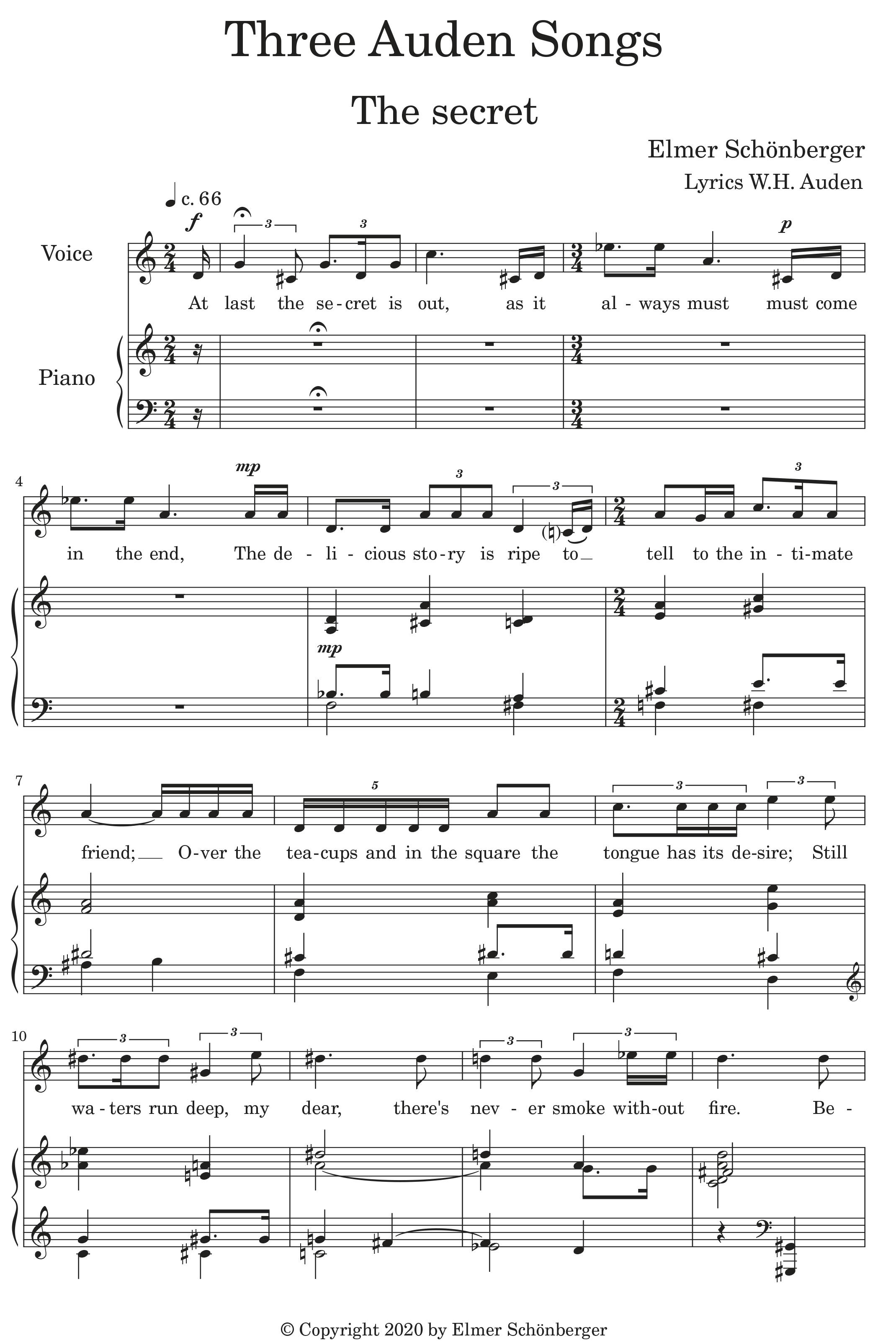 Strikt genomen is er maar één verbindend element in mijn Three Auden songs, namelijk W.H. Auden, de tekstdichter. Het begon met ‘The more loving one’, een van Audens mooiste (en ook bekendste) gedichten, met als sleutelzin ‘If equal affection cannot be / Let the more loving one be me.’ Het tweede gedicht, ‘For what as easy’, heeft met zijn kortademige zinnen van tweevoetige jamben iets van een aftelrijmpje. Het ironische eerste gedicht, ‘At last the secret is out’, is precies zo Engels als de theekopjes en de croquetwedstrijd waarvan sprake is, maar vergis je niet: ‘there is always another story, / there is more than meets the eye’.